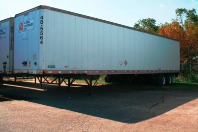 The original semi-trailer that was used to obtain detailed physical measurements for the initial FE model developed in Phase A of this project was a 16.2-m (53-foot), dual-tire, tandem axle 2004 Stoughton box trailer located on a Columbus, Ohio Freightliner dealer's lot. It was a 14.6-(48-foot), dual-tire, tandem axle 1990 Stoughton box trailer obtained from National Semi-Trailer Corp. in Columbus, Ohio, and was very similar structurally to the original semi-trailer. Both trailers were equipped with Airide suspension systems.