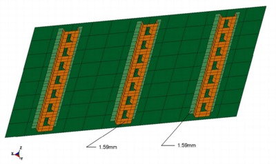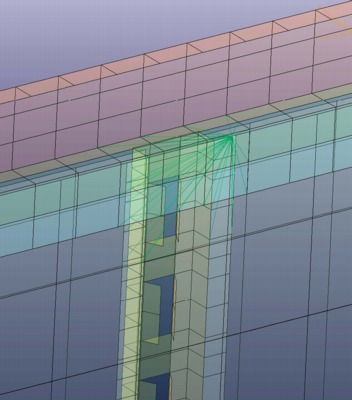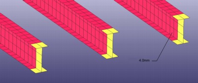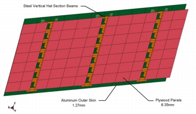The element size was nominally 100 mm (4-inches) for the elements of the Outer Aluminum skin and the Plywood Panels. The element size was nominally 20 to 40 mm (0.75 to 1.5-inches) for the steel vertical hat-section beams. This element size was chosen because it was reasonable for the geometry definition and it would not adversely affect (decrease) the current typical time step size. These vertical beams were connected to the Outer skin and the Aluminum Panels via "solid weld-elements" using *Mat_Spotweld in Ls-Dyna.