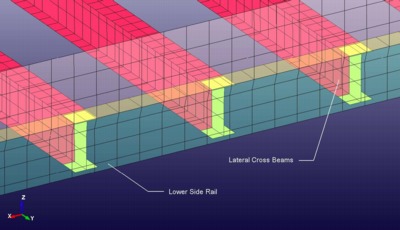 The Lateral Cross Beams are connected to the Lower Side Rails using a tied shell edge contact.
