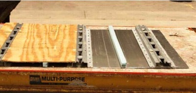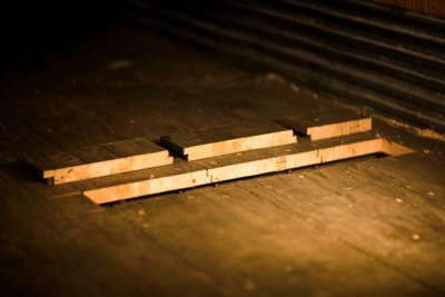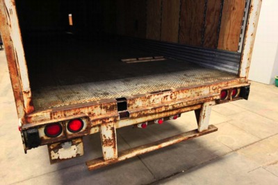 The wooden floor of the cargo box is comprised of 10-inch wide, 1.25-inch thick laminated oak planks oriented longitudinally across the full width of the trailer. The individual planks are butted together with step-joints and are bolted to the main lateral cross beams. A section was cut out of the floor to reveal these details.