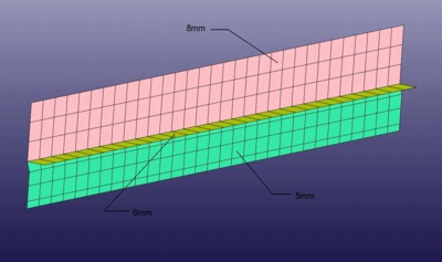 The rear bumper components were connected to each other using common-nodes and LS-Dyna weld elements. LS-Dyna weld elements are implemented using solid elements with element connectivity specified to define the normal orientation of the welded connection. The *Mat_Spotweld material model is used to define weld-joint failure mode - if desired. The *Contact_Tied_Surface_to_Surface option is used to define the actual connection of the welded parts.