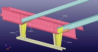 The overall dimensions and plate thicknesses of the Lateral Cross-Beams were measured directly. Sketches were made and photographs were taken. The FE model was created directly from this information using HyperMesh. LS-Dyna Type 16 fully-integrated thin-shell elements were used for the Lateral Cross-Beams. The element size was nominally 25 mm (1-inch) for the flange elements and ~30 mm (1.25-inch) for the web elements. This size was chosen because it was the minimum reasonable size to represent the geometry and it would not adversely affect (decrease) the current typical time step size.