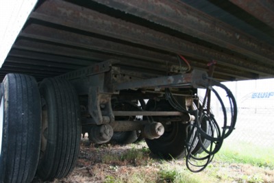 The rear frame is comprised of fixed longitudinal members that are welded to the lateral side beams. The bogie is comprised of the wheels, frame, tires and axles, and the suspension system of the trailer. The bogie is longitudinally adjustable by the driver/operator to accommodate various loading situations. The rear frame and bogie were accessible for measurement and did not require dissection to obtain component thickness and geometry - with the exception of the rear axles. A hole was drilled in one of the axles to obtain the axle tube's thickness.