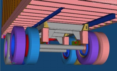 In general, the connectivity within the rear frame, the wheels, and axles was done with common-node connections. The connection of the fixed-to-movable frames was sliding contact, with spotweld elements at four points fixed to the (moveable) bogie longitudinal frame rails, and in tied contact with the (fixed) trailer longitudinal frame rails. This will allow the user to move the bogie fore/aft without having to re-specify or reconnect CNRBs. The wheels were connected to the axles via spherical joints enabling them to rotate. The pivot arms are connected to the frame components via spherical joints enabling them to rotate.