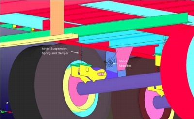 The trailer suspension's spring and shock-absorber elements were implemented using LS-Dyna discrete elements (springs and dampers) - the Airide suspension system's air bag's properties and shock-absorber properties were copied from the tractor's suspension system which were obtained by physical testing described in the Phase A final report.