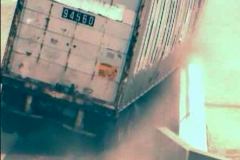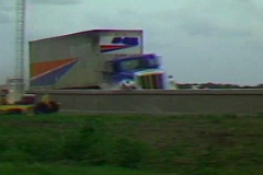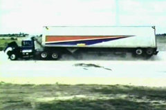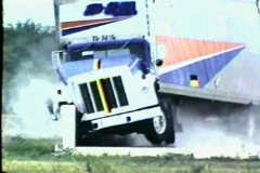 The tractor was equipped with a triaxial accelerometer block mounted near the center of gravity of the tractor and a biaxial accelerometer block mounted over the rear tractor tandems. Two biaxial accelerometer blocks were also placed inside the trailer: one set mounted toward the front near the king-pin and one set toward the rear over the trailer tandem axle. Note: there was no instrumentation to measuring angular displacement of the vehicle. Three high-speed film cameras were used to film the crash test: