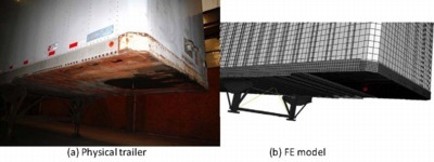 The new trailer model was developed based primarily on the geometry of a 53-ft Stoughton trailer. The CAD geometry was obtained through a collaborative effort between research team and Digimation. Research team staff visited a local Freightliner dealer and surveyed the trailers on their lot. Photographs and measurements were taken and provided to Digimation for use in developing the CAD geometry. This geometry was then used by the research team to develop the FE mesh of the semi-trailer.