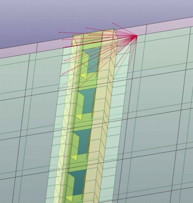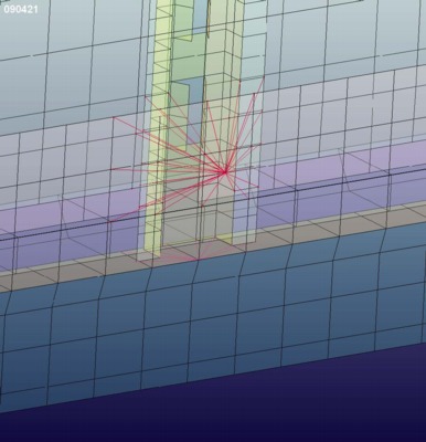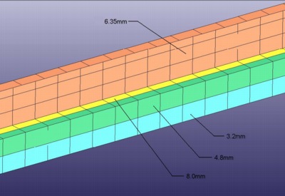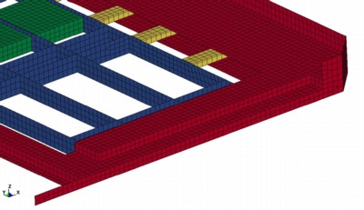 The element size was nominally 100 mm (4-inches) for the elements of the Outer Aluminum skin and the Plywood Panels. The element size was nominally 20 to 40 mm (0.75 to 1.5-inches) for the steel vertical hat-section beams. This element size was chosen because it was reasonable for the geometry definition and it would not adversely affect (decrease) the current typical time step size. These vertical beams were connected to the Outer skin and the Aluminum Panels via "solid weld-elements" using *Mat_Spotweld in Ls-Dyna.