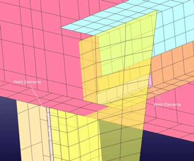 The rear bumper components were connected to each other using common-nodes and LS-Dyna weld elements. LS-Dyna weld elements are implemented using solid elements with element connectivity specified to define the normal orientation of the welded connection. The *Mat_Spotweld material model is used to define weld-joint failure mode - if desired. The *Contact_Tied_Surface_to_Surface option is used to define the actual connection of the welded parts.