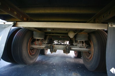 The trailers that the FE model was based on had airbag "Airide" rear suspension systems with a moveable wheelset (bogey) with fore-aft position adjustment. This wheelset consists of a longitudinal steel frame with four main crossmembers (called the slider subframe). It has two main axles with four (dual) wheels/tires on each axle and suspension pivot arms to accommodate movement of the airbag "springs" and shock absorbers.