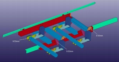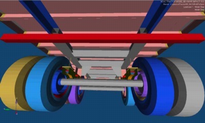 In general, the connectivity within the rear frame, the wheels, and axles was done with common-node connections. The connection of the fixed-to-movable frames was sliding contact, with spotweld elements at four points fixed to the (moveable) bogie longitudinal frame rails, and in tied contact with the (fixed) trailer longitudinal frame rails. This will allow the user to move the bogie fore/aft without having to re-specify or reconnect CNRBs. The wheels were connected to the axles via spherical joints enabling them to rotate. The pivot arms are connected to the frame components via spherical joints enabling them to rotate.