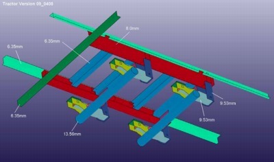 The overall dimensions and plate thicknesses of the rear frame and the bogie components were measured directly. Sketches were made and photographs were taken. The FE model was created directly from this information using HyperMesh.