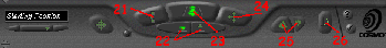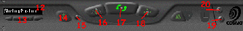 12. Name of Current Viewpoint; Displays current viewpoint. 13. Select Viewpoint; Allows selection of various views around and inside the model. 14. Seek; Allows user to focus on the selected area of the model. 15. Control Switch; Allows for a new set of controls. 16. Zoom Button; Zooms the camera. 17. Rotate Button; Rotates the model. 18. Pan Button; Pans the camera. 19. Preferences; Allows change of many of CosmoPlayer's settings. 20. Help; CosmoPlayer help. 21. Tilt; Rotates the camera. 22. Gravity on/off; If on, requires user to stay on the ground in a virtual world. 23. Walk; Moves camera forward. 24. Slide Button; Slides the camera in the plane orthogonal to the viewer. 25. Undo/Redo; Deletes the last move made by the user. 26. Straighten; Will make the camera parallel with the xz plane.