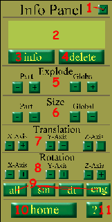 1. Minimize Button; Decreases the size of the Info Panel, keeping it out of view. 2. Part Info; Displays the information about the selected part, such as title and/or location 3. Info Button; Brings up an HTML document with detailed information about the selected part 4. Delete Button; Removes the selected part from the model. To view the deleted part again, the whole model must be reloaded. 5. Explode Function; Will move either the selected part or all parts away or closer to the center of the model. 6. Size Function; Will resize either the selected part or all parts. 7. Translation Function; Will move the selected part along the x, y or z axis. 8. Rotation Function; Will rotate the selected part along the x, y or z axis. Part will automatically return to it's original position when a new rotation is started. 9. Navigation Buttons; all-loads the full model; sm-loads only sheet metal parts; dt-loads only drivetrain; eng-loads only engine. 10. Home Button; Returns the viewer to the home page. 11. Help Button; This document.